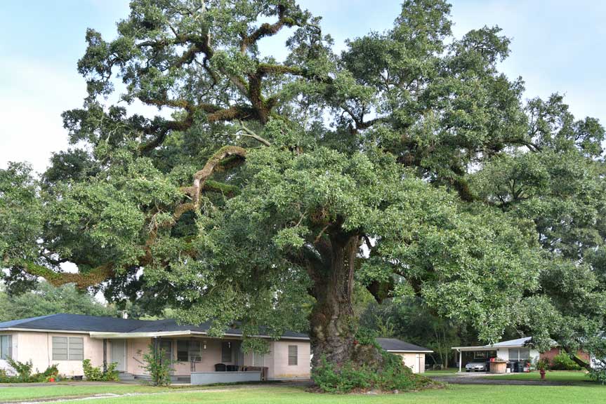 The John Hudson Oak is located in Prairieville, LA at the Hudson House, a beautiful historic family home that’s been in the Hudson family for several generations. The John Hudson Oak is the largest and most impressive of numerous live oaks on the grounds. It has a lovely sweeping canopy that reaches to the ground on three sides. Mrs. Ellen Hudson Waller says that several other oaks on her property are Live Oak Society members.