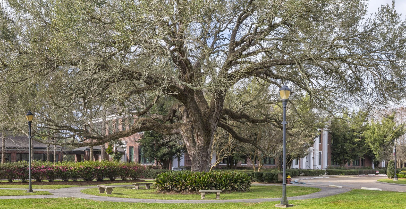 The Hudson Oak is the largest and most impressive of numerous old live oaks on the grounds. It has long sweeping limbs that reach to the ground on three sides. Mrs. Ellen Hudson Waller says that this and several other oaks on her property are Live Oak Society members but has no idea exactly how old this oak might be.